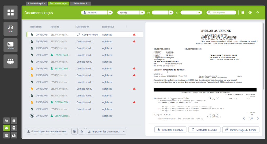 Ainsi, vous recevez directement les résultats de ces dernières dans DrSanté. Cette fonctionnalité permet de simplifier le stockage de documents, mais également de gagner du temps dans la transition de ces documents entre les différents services médicaux.